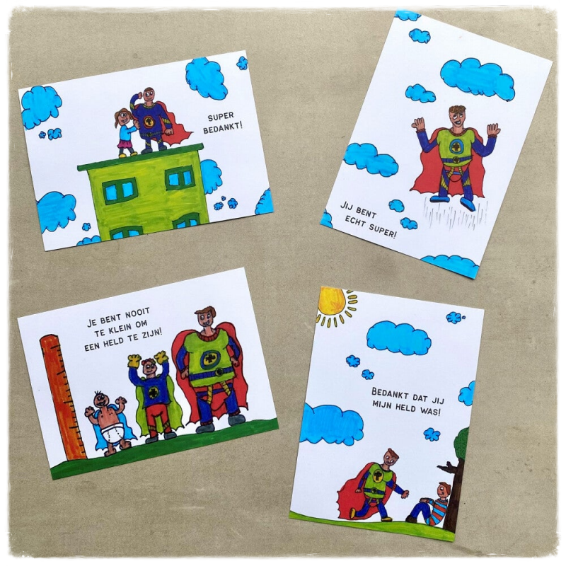 Wil jij ook deze leuke heldenkaarten? Dat kan! Ze zijn vanaf nu hier beschikbaar. Een setje van 4 kaarten voor maar 3 euro!